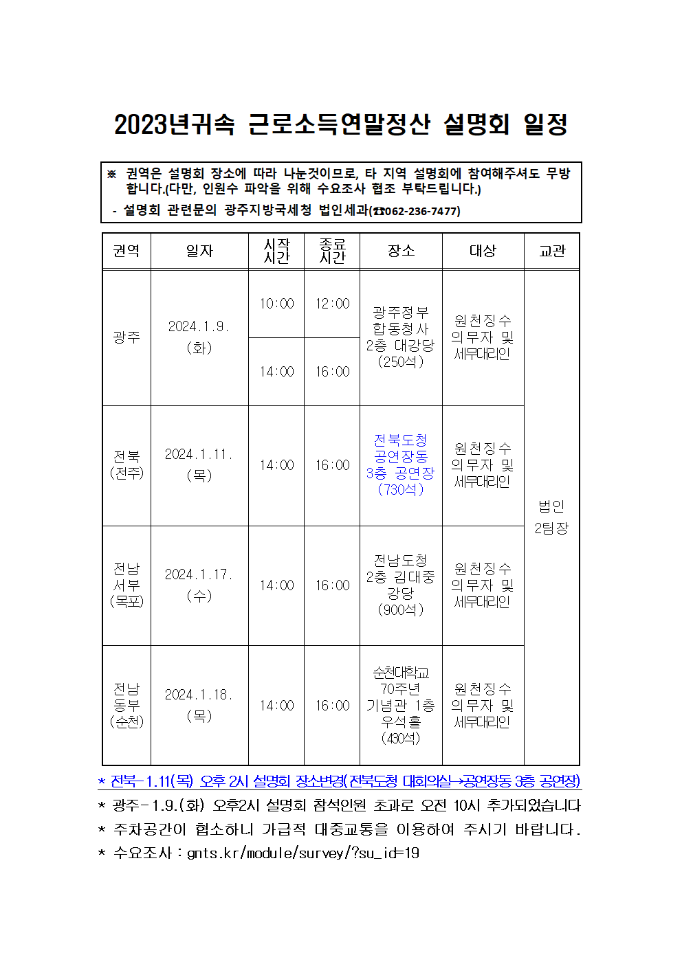 2023년 귀속 근로소득 연말정산 설명회 일정 안내