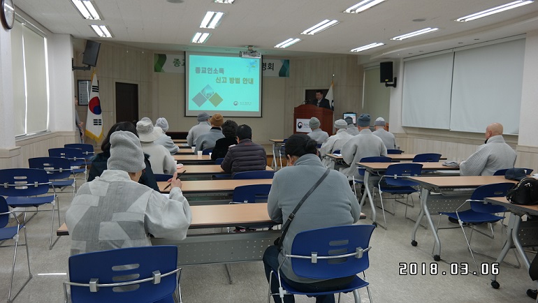 익산세무서장(이세협)은 '18.03.06. 14:00 익산세무서 별과 회의실에서 불교 스님 등 20여명을 대상으로 2018.01.01.부터 시행되는 종교인 소득 과세에 대한 설명회를 개최하였다.이날 종교인 소득 중 과세소득 과 비과세소득에 대해 항목별로 상세히 설명하고, 종교인소득은 기타소득으로 신고가 원친ㄱ이나, 본인 선택으로 근로소득으로 신고 가능하다는 것을 설명하며, 두 소득의 계산방법 차이와 납부세액 크기에 대해 비교 설명하였다.